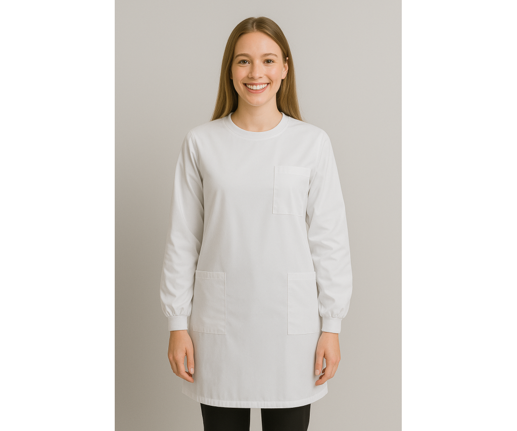 Ref 02: bata com gola redonda de apertar atrás, com manga comprida e punho de malha.
