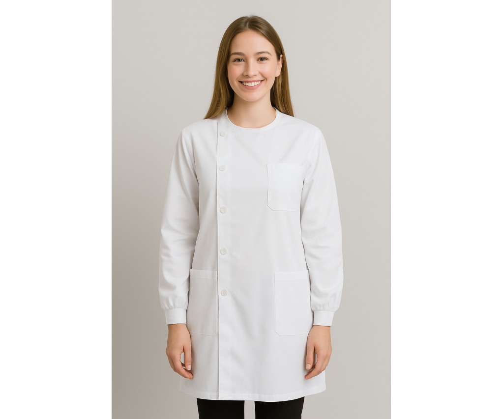 Bata para uso médico e hospitalar.Este modelo aperta com 5 botões e tem 1 bolso no peito e 2 bolsos ..